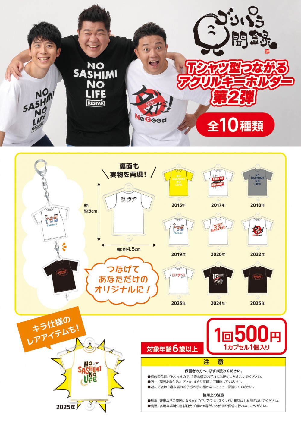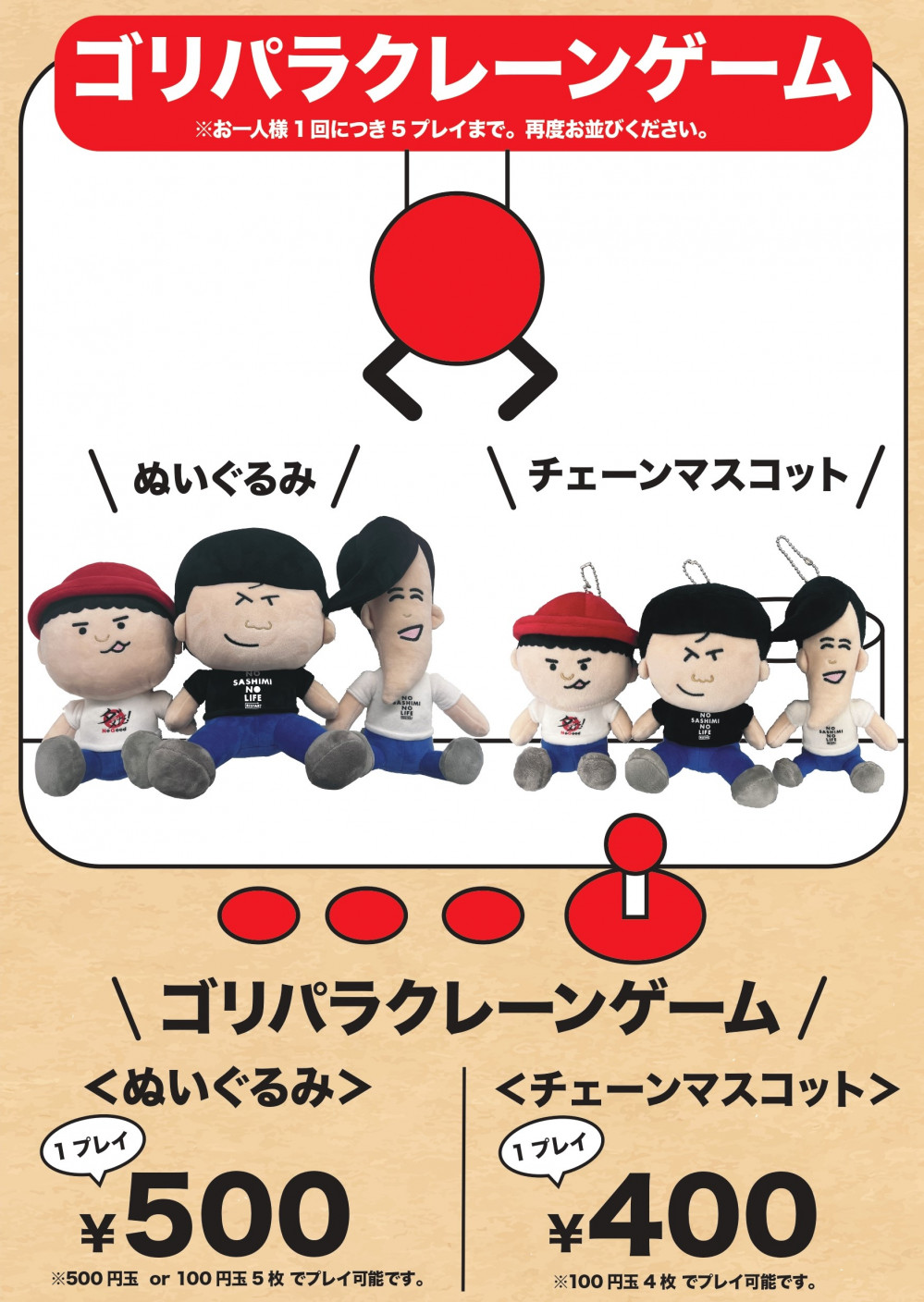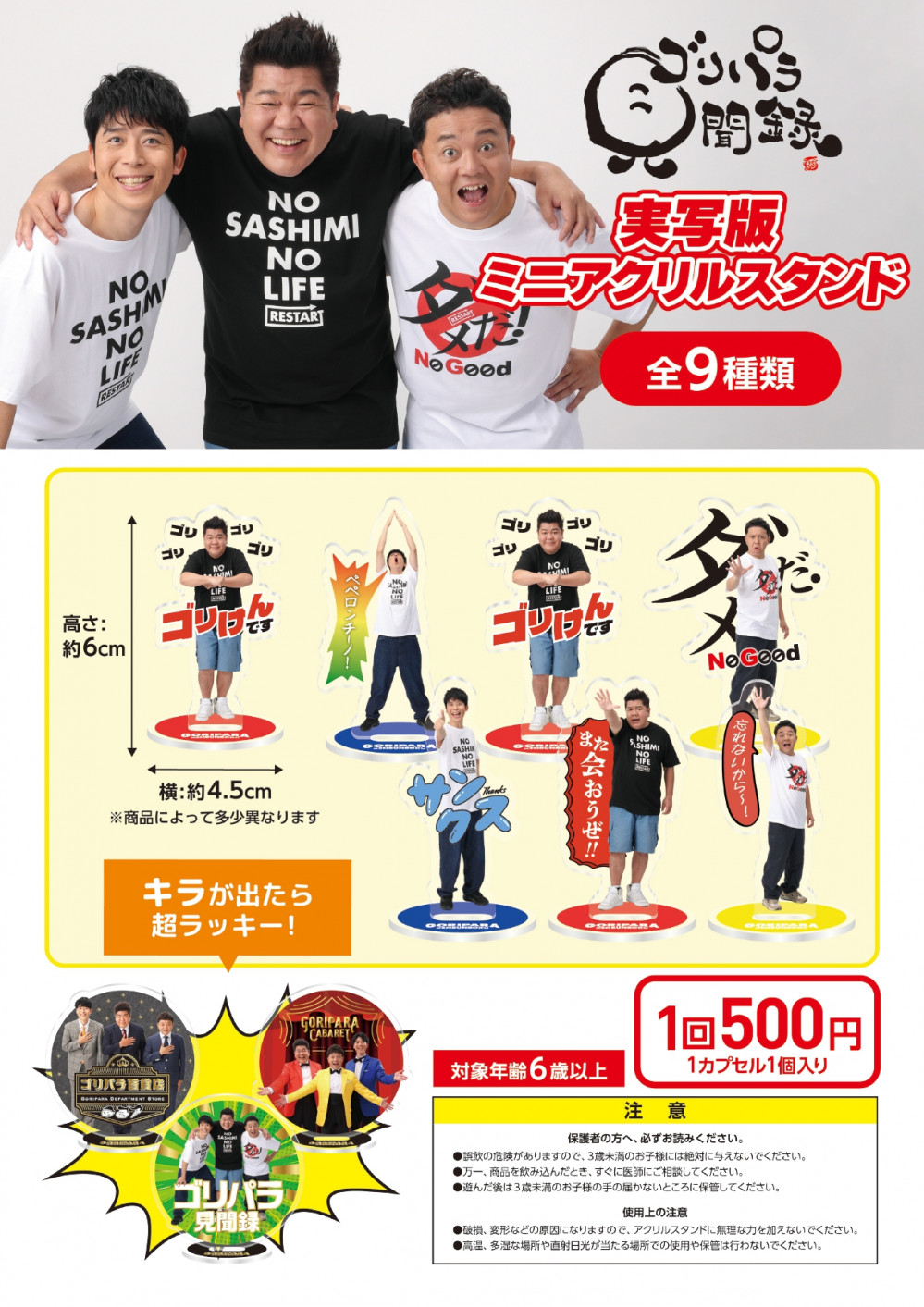 | 内容 | ・新カプセルトイ(実写版ミニアクリルスタンド・Tシャツ型つながるアクリルキーホルダー第2弾) ・クレーンゲーム(ぬいぐるみ・チェーンマスコット) ・グッズ販売(レギュラーグッズのほか、ゴリパラ百貨店グッズ・キャバレーグッズ一部在庫あり) |