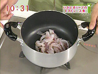 いかは内臓を足を抜き、胴は皮をむいて1センチ厚さの輪切り、 足は目と口を取り除き、3~4本ずつに切り分ける