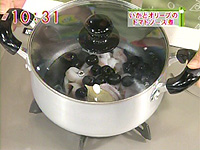 鍋にいかと黒オリーブ、白ワイン、ローリエを入れ、 ふたをして1~2分蒸し煮にする