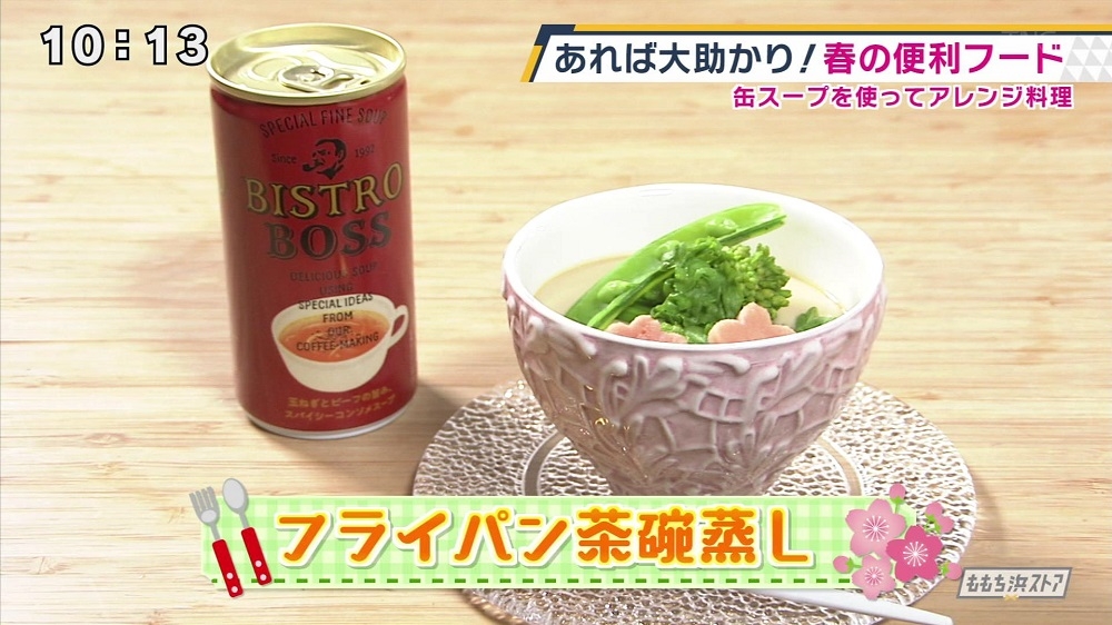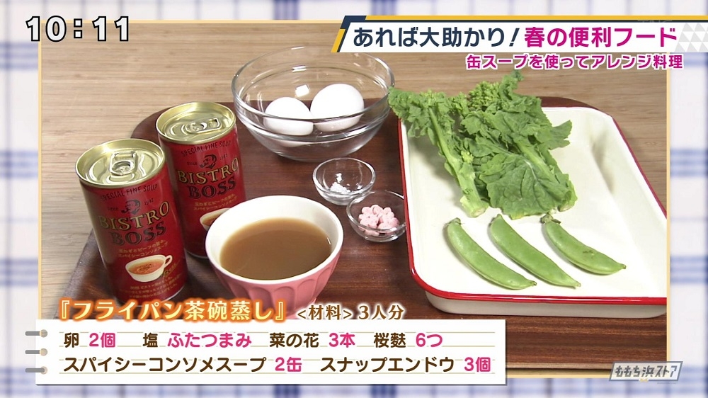 ①卵をボウルに割り入れる ②卵の白身が全体に行きわたるように卵を切るように混ぜる ③塩を加える ④コンソメスープ缶を入れる ⑤スープは味付け用に大さじ2杯分とっておく。残しておいた缶スープを使って桜麩を戻す。 ⑥卵を濾して器に移し蓋またはラップをする ⑦ふきんがあれば入れ、お湯を張ったフライパンに器を入れてフタをして中弱火で15分蒸す ⑧菜の花やスナップエンドウ、桜麩を盛りつけたら完成