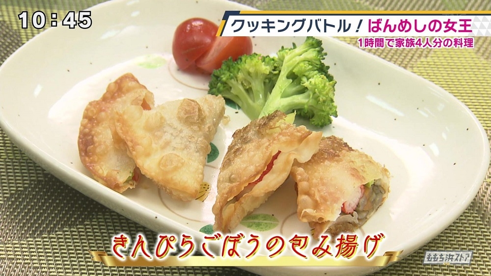 ①ごぼうとにんじんをはささがきにして油で炒め、しんなりしたら調味料を入れ、水気がなくなるまで炒り煮にする。 ②ぎょうざの皮を広げてきんぴらごぼう、カニカマ、ブロッコリーをのせ2つ折りにして半分水をつけ閉じる。 ③油で揚げる。 ④皿にレタス、ミニトマト、ブロッコリーを添えて半分に切った包み揚げを置き、お好みでポン酢を付けたら完成。