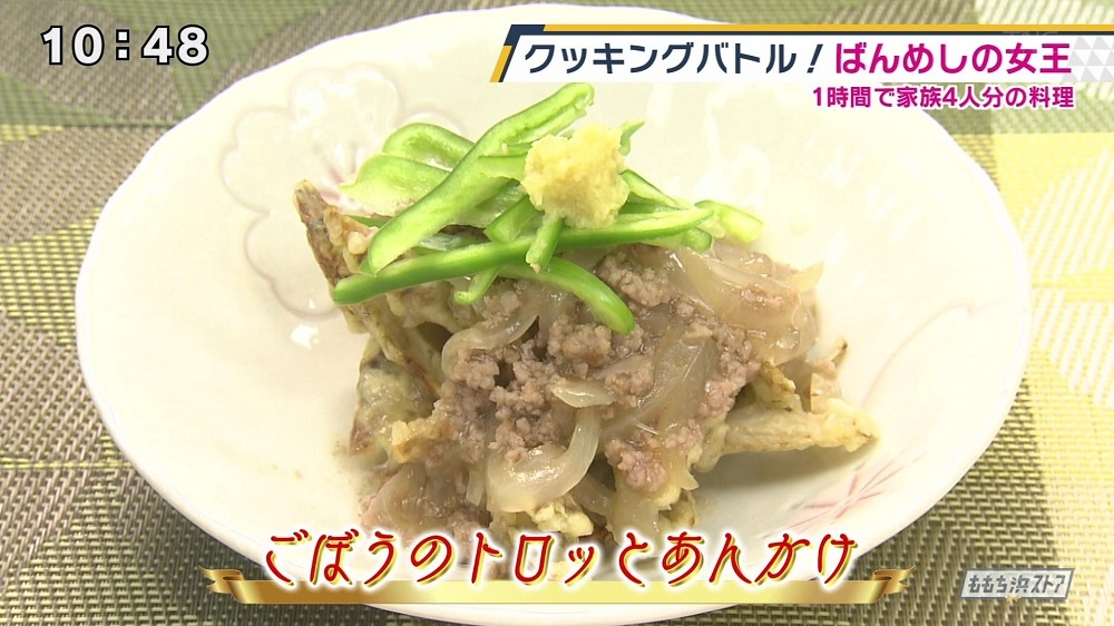 ①薄切りにしたピーマンを水につける。 ②玉ねぎを薄切り、ごぼうを長めのささがきにする。 ③豚ひき肉と玉ねぎを炒める。 ④③の中にだし汁を入れて煮る。 ⑤④に調味料を入れて味を調える。 ⑥⑤に水溶き片栗粉でとろみをつける。 ⑦盛り付けたらピーマンとしょうがをのせて完成。