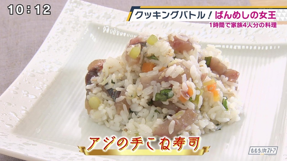 ①にんじんをサイの目、ふきを適当な大きさにきる ②①を塩を入れたお湯で分ほど茹でる ③みょうが、大葉をみじん切りにする ④アジを枚におろし1cm幅に切りAで下味をつける ⑤Bで酢飯を作りごまと④を合わせる ⑥さくっと混ぜ合わせたら完成