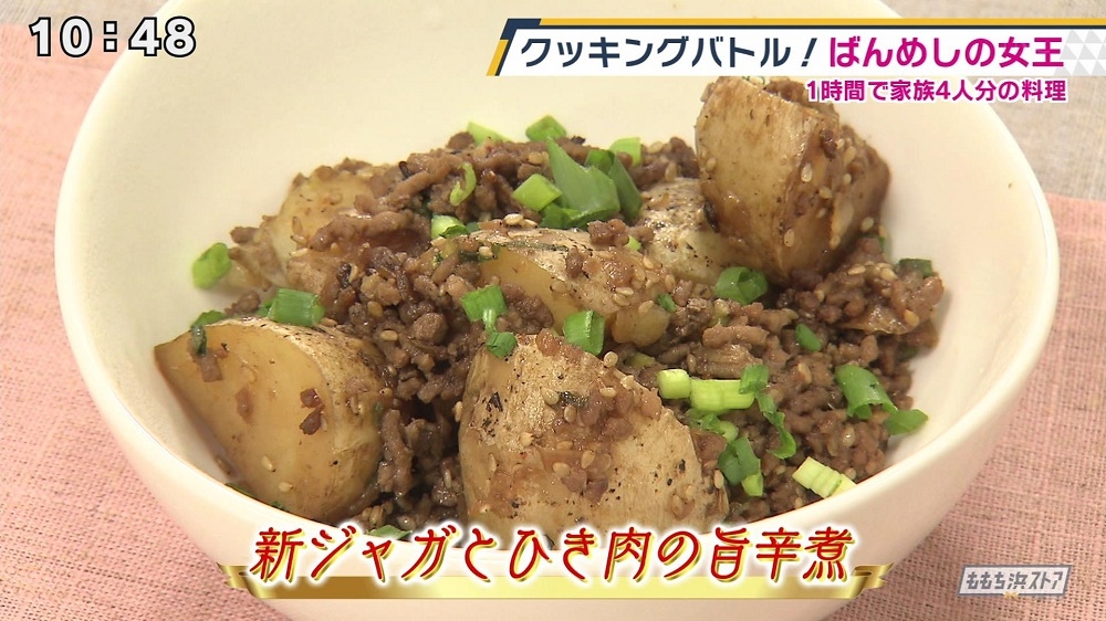 ④③のフライパンにひき肉を入れおたまの背で押さえながら炒め、