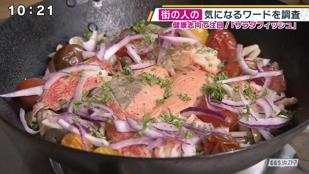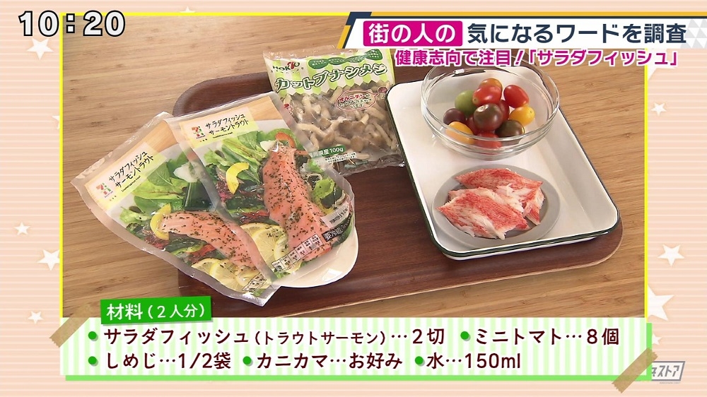 サラダフィッシュ(トラウトサーモン) 2切 ミニトマト 8個 しめじ 1/2袋 カニカマ お好み 水 150ml