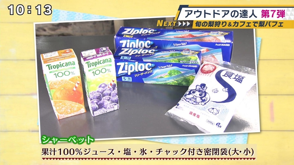 ①チャック付き密着袋(小)にジュースを入れて密封。 ②チャック付き密着袋(大)に氷と塩と①を入れる。 ③タオルに包みひたすら振る。