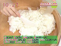 炊きたての米を桶に移し、少しほぐして合わせ酢をかける 2~3分程度、そのままにしておく