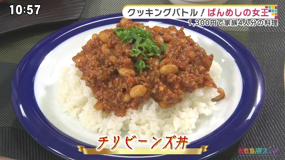 ①油をひいたフライパンにみじん切りの玉ねぎを入れ炒める。 ②①があめ色になったらにんにくチューブ・豚ひき肉を入れてさらに炒める。 ③ひき肉の色が変わったら、トマト缶・ミックスビーンズを入れてしばらく炒める。 ④③にチリパウダー・クミン・塩こしょう・ケチャップ・ウスターソースを入れて味をととのえ、15分~20分煮詰める。 ⑤皿にごはんを盛り、④をのせたら完成。