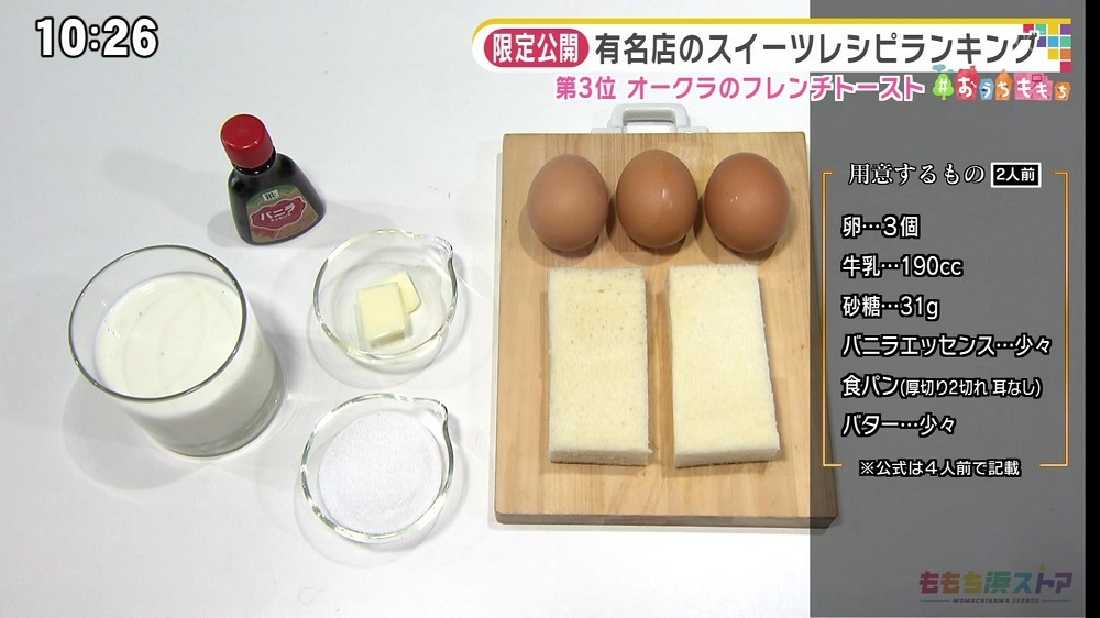 卵 3個 牛乳 190cc 砂糖 31g バニラエッセンス 少々 食パン(厚切り・約4cm) 2切れ(耳なし) バター 少々