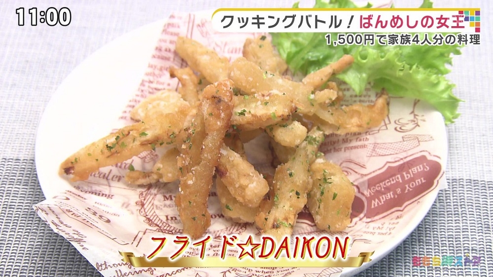 ①大根を約8センチ、8ミリ幅の短冊切りにする。 ②Aを混ぜ、①を漬け込み10分~15分置く。 ③②に薄力粉を加え混ぜる。 ④③をバットに入れ片栗粉をまぶす。 ⑤180度の揚げ油にひとつずつ入れ、表面がきつね色になるまで3~4分揚げる。 ⑥仕上げに青のりをまぶしたら完成。