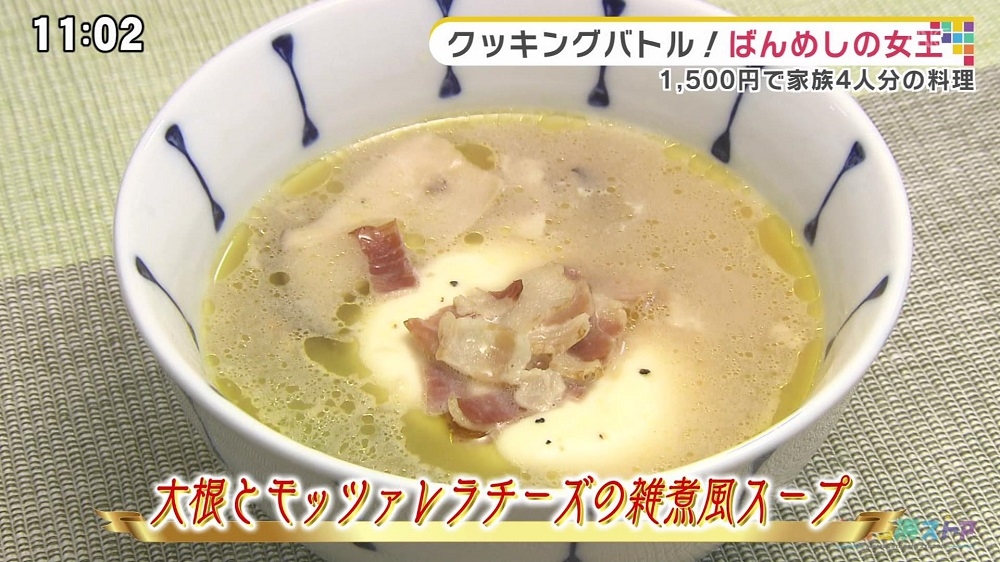 ⑧器に大根、モッツァレラチーズ、エリンギを入れ、最後にベーコンとスープを流し入れ、茹でた大根葉を青味としていれたら完成。