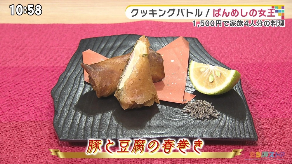 ①木綿豆腐をキッチンペーパーで包んで水切りをしておく。 ②8等分に切った木綿豆腐に豚ロースを巻く。 ③春巻きの皮に大葉、②をのせて巻く。 ④180度の油で片面3分づつきつね色になるまで揚げる。 ⑤仕上げにみじん切りにした塩昆布、かぼすをかけて完成。