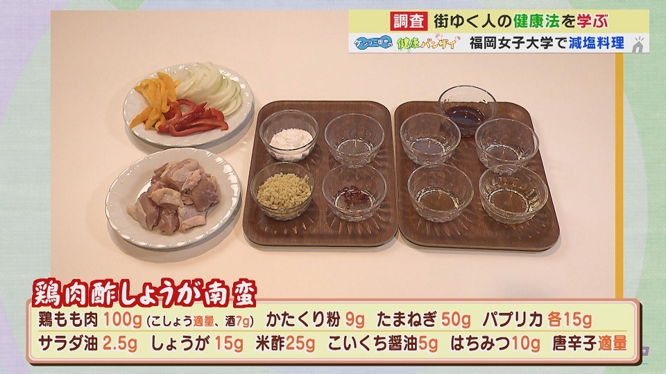 ①こしょうと酒で下味をつけた鶏肉を焼き、野菜も入れて炒める