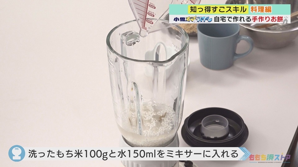 【作り方】 ①洗ったもち米100gと水150mlをミキサーに入れる