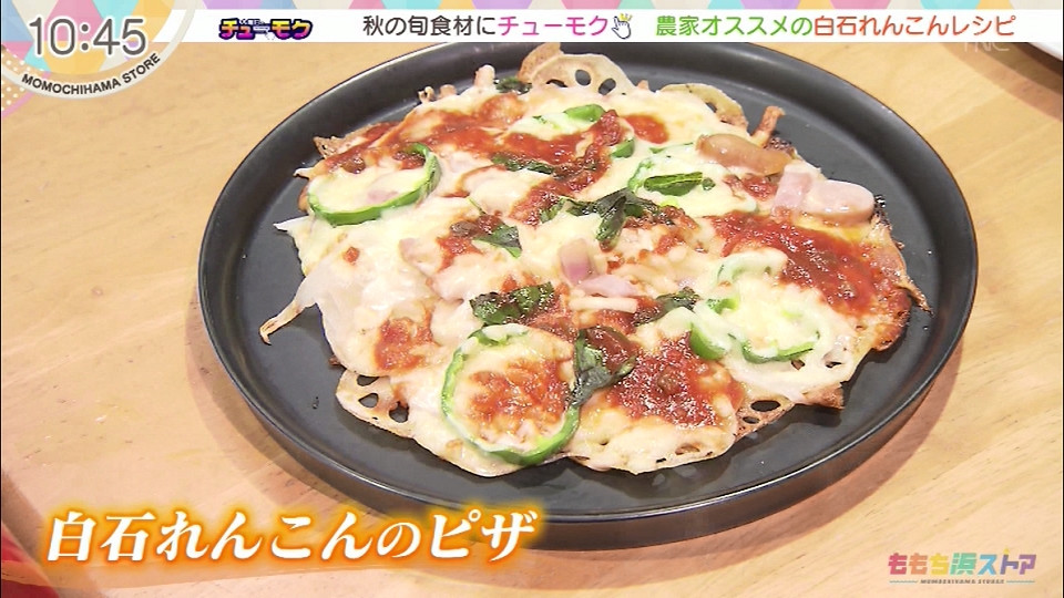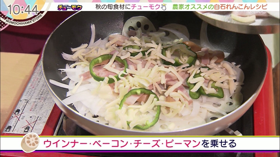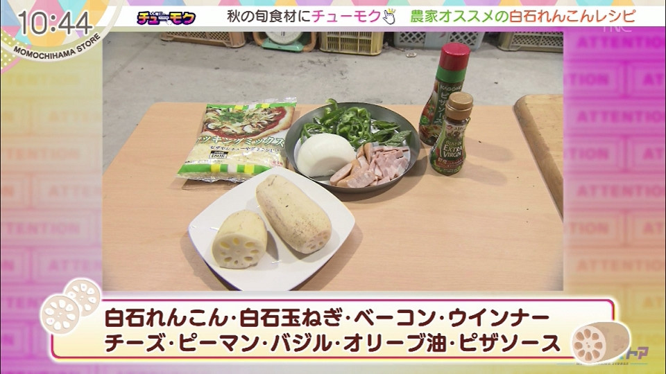 白石れんこん 白石玉ねぎ ベーコン ウインナー チーズ ピーマン バジル オリーブ油 ピザソース