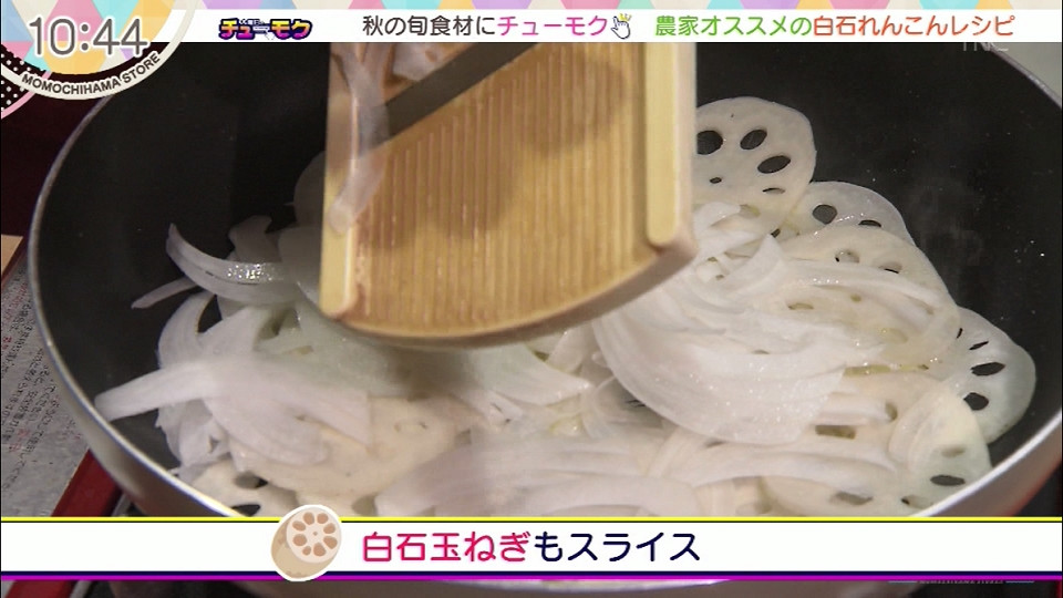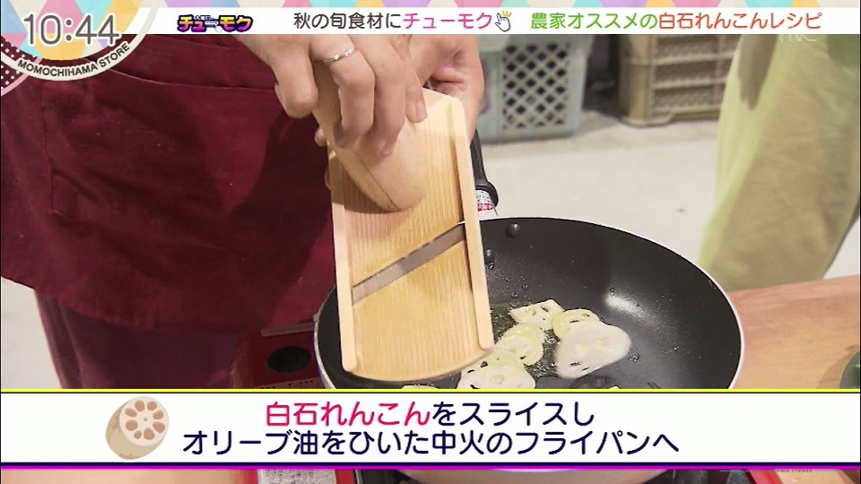 ①新白石れんこんをスライスし、オリーブ油をひいた中火のフライパンへ。