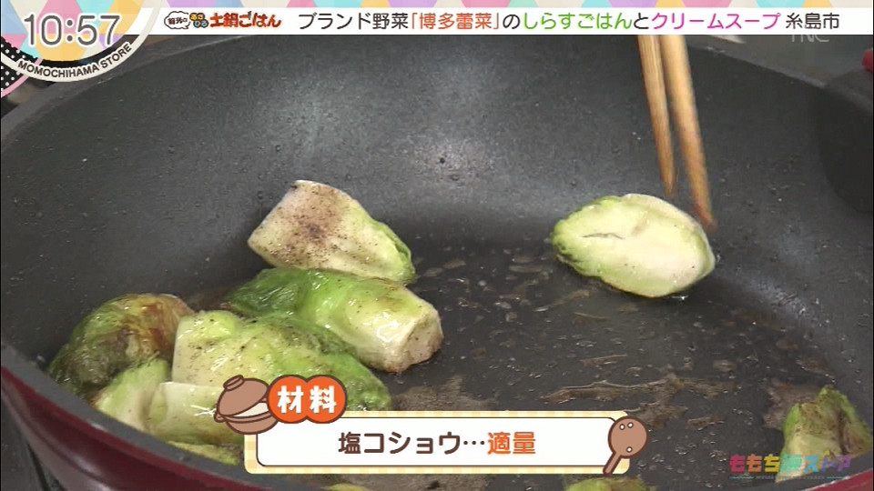 ⑥同じフライパンで蕾菜もこんがり焼き色をつけ、塩コショウで味付け。