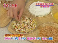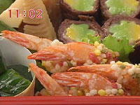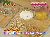 えびの水気をふき取って強力粉、溶き卵、あられを順につけて油でカラリと揚げる *あられがない場合は、柿の種(ピーナッツは除く)を細かく砕いてまぶしつけるとよい