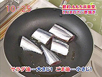 フライパンにサラダ油とごま油を熱し、さんまを並べて両面に焼き色をつける