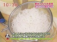 鍋に糸こんにゃくとひたひたの水を入れ、沸騰したら3分ゆで 茹で上がったらざるに上げて水を切り、ざく切りにする
