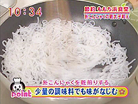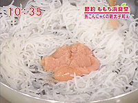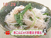 汁気がなくなったら、薄皮に包丁で切り目を入れた明太子を加えてほぐし、 ざく切りにした三つ葉を散らす ☆ポイント☆ 糸こんにゃくは乾煎りする→少量の調味料で味がなじむ