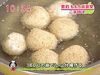(1)でようかんを包んでごまをまぶしつけ、160度の油で2分程度揚げる ☆ポイント☆ 白玉粉をこねるときは水を少しずつ加える→生地の固さを調整するため