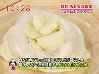 じゃがいもは皮をむき、1センチの輪切りにし、ポリ袋に入れて電子レンジで8分加熱する (100gにつき2分程度が目安です)