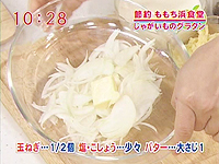 薄切りにした玉ねぎを耐熱容器に入れ、塩・こしょうをふり、バターを上に乗せ、 電子レンジで3分加熱する