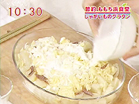 (2)の耐熱容器に(1)のじゃがいもと手でちぎったアンチョビを交互に加え、 チーズを散らし、さらに生クリームをかける