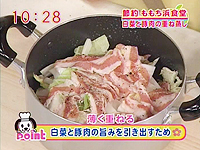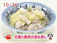 ふたのできる鍋を用意し、白菜→豚肉と一段ずつ平らに重ね、最後に酒を加え、ふたをして中火にかける