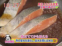 煮汁が少なくなってきたら、(1)のネギを戻し入れ、さっと煮る ☆ポイント☆ 調味料が煮立ってから魚を入れる→魚の臭みをなくし、鮭の旨みを閉じ込める ふたで密閉しない→生臭さを含んだ蒸気が水滴になって落ち、生臭さがまた魚に戻ってしまうため