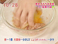 鶏ひき肉に調味料を加えてよく練り、粘りが出たところでたまごと片栗粉、しょうがのみじん切りを加えてさらに混ぜる
