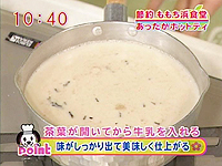 紅茶の葉が開いたら牛乳を加えてあたため、沸騰直前で火を止め、茶漉しでこす ☆ポイント☆ 水と牛乳で作る→茶葉がよく開いておいしい