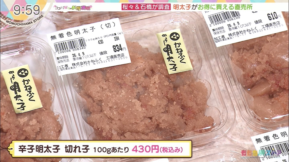 辛子明太子 切れ子 100gあたり 430円(税込み)